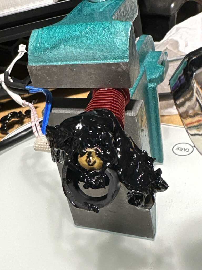 something went wrong during printing, and the toolhead just filled itself with solid plastic. I was able to get the hotend out though, and begin working it in my vice using a soldering iron. I was a bit concerned wit the status of the heater core.